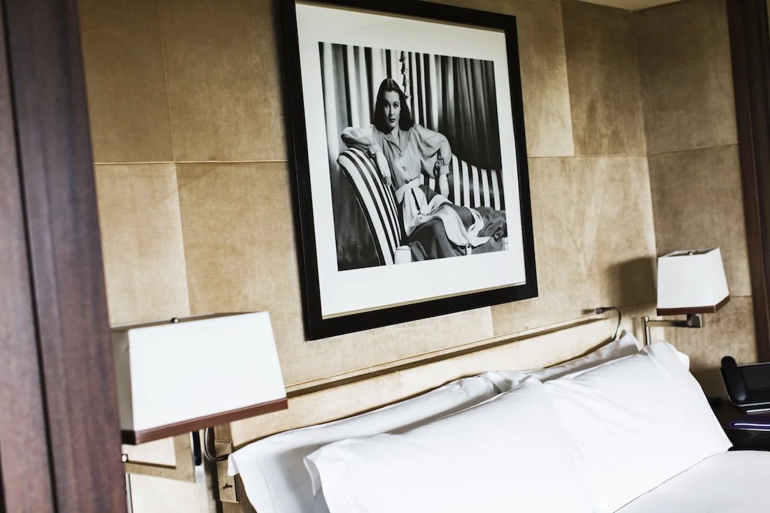 柔らかな陽射しを感じ、低層階の窓からハイド・パークを目の前に、上質な時間を過ごすことができるスイートルーム「Park Lane Suite」。リビングとダイニングのゆったりとしたエリアを持ち、寝室には女優のポートレートアートが飾られている。