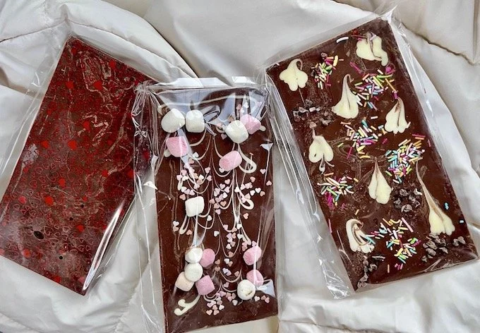 ナッツ、ドライフルーツ、マシュマロ、カカオニブといった好きなトッピングを自由に散らしてデザインし、組み合わせ次第で世界に1枚だけのオリジナルチョコレートが完成する。出来上がったチョコレートはラッピングしてくれるので、お土産に持ち帰ることができる。