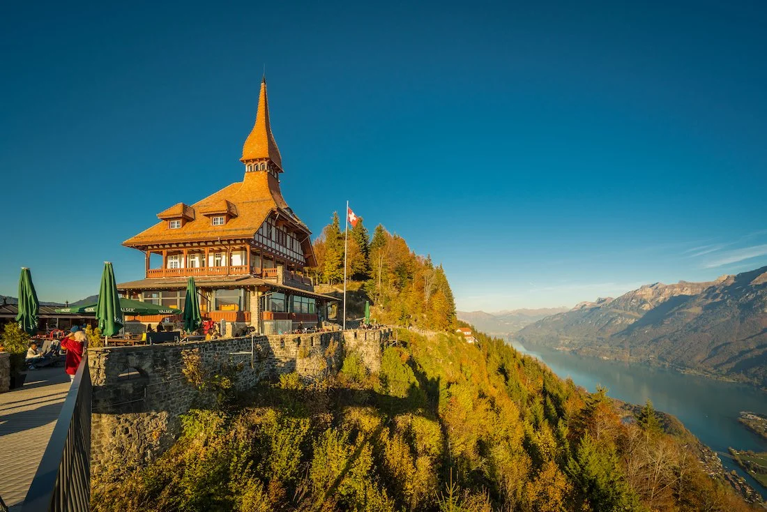 山頂には「ハーダー・クルム・パノラマ・レストラン」があり、景色を眺めながら本格スイス料理を味わえる。サンセットタイムは、外のテラスも人気。山の稜線の上に夜は星が瞬き、屋内ではインターラーケンの夜景とともに本格的なディナーコースを楽しむ。秋限定のメニューは、ジビエなど肉料理も美味しい。