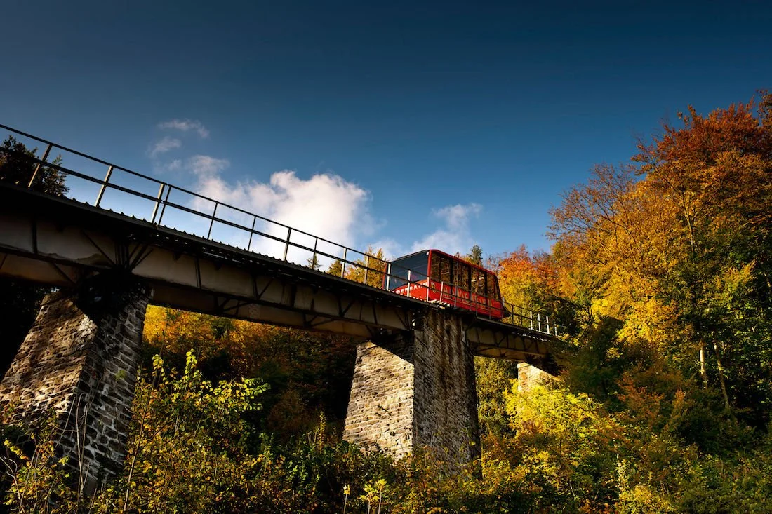 パノラマの景色が広がるケーブルカー、Harderbahn(ハーダーバーン)で森の中の急勾配を登り、標高1,332mの頂上までわずか15分程度で到着する。乗車がスムーズなユングフラウVIPパスで、気軽に絶景へアクセスできる。