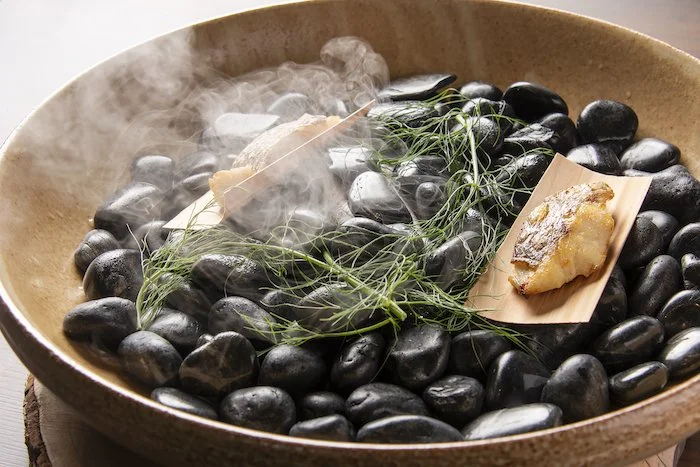魚料理の真鯛は、石の上で煙を立てて運ばれる。ゲストの目の前でサーブし、アミエビソースをかけていただく。