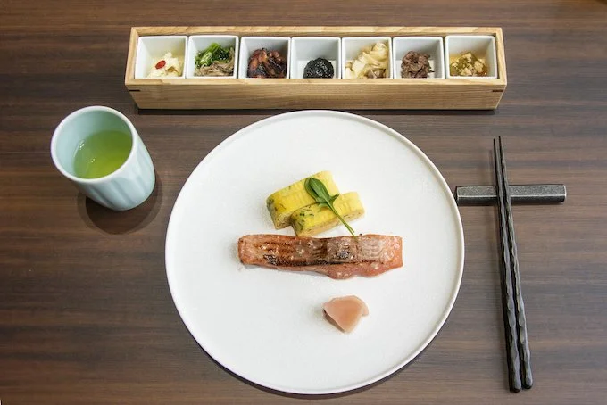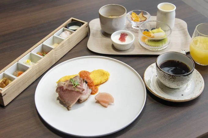 朝食は、メインを和定食と洋定食から選ぶ。和洋とも当日の仕入れによって変わる小鉢の料理が提供される。この日は、洋食は主菜の日光HIMITSU豚金山寺味噌焼きにオムレツ、蕪甘酢漬けに、甘酒スムージーや味噌ラタトゥイユ、モッツァレラチーズのたまり漬けなどの小鉢。和食は、プレミアム八潮鱒の塩麹漬け、厚焼き玉子の主菜に、小鉢のとちぎ和牛しぐれや無農薬かぼちゃのそぼろ煮などだった。
