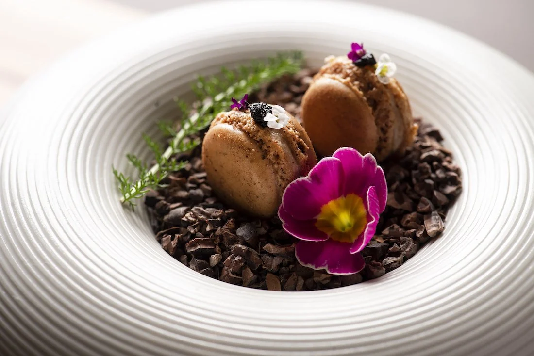最初の料理は、一口サイズのオードブル。日光鱒とじゃがいものコンフィ、日光HIMITSU豚のマカロン、河内ふぐのエスカヴェッシュ。栃木県産の素材を、色鮮やかに活かしている。日光の自然で育てられたブランド豚をリエット風に挟み、カカオ、黒大蒜(くろにんにく)が味のアクセントになっている。