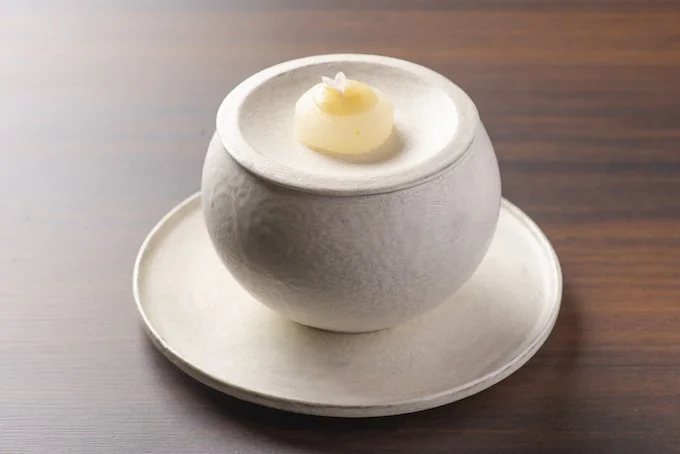 柚子が乗った大根の蓋を開けると、甘酒のスープ。まず、スープを飲んで、大根を食べるときにスープや柚子に絡めていただく。見た目にも美しい一品だ。