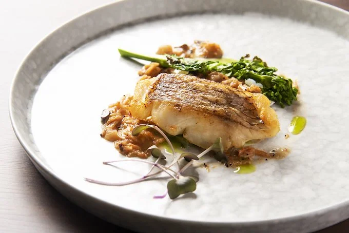 鮮やかな魚料理の一皿は、鮑料理。東北の未来を願って、三陸でとれた魚介を用いて独自の感性でテーブルを彩る。美しい翡翠色の鮑を活かしている。