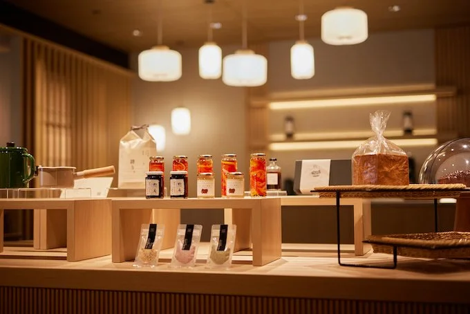 レストランに併設されたライフスタイルストア「会」は、地域・食・温泉をテーマにしたショップ。店内には日光の工芸品、焼き物のテーブルウェア、発酵食品など地産の商品が並ぶ。オリジナルのケーキ、スイーツもあり、パンのブリオッシュは焼き立てを数量限定で販売している。レストランで使用されている一部のオリジナル食器や食材なども販売している。