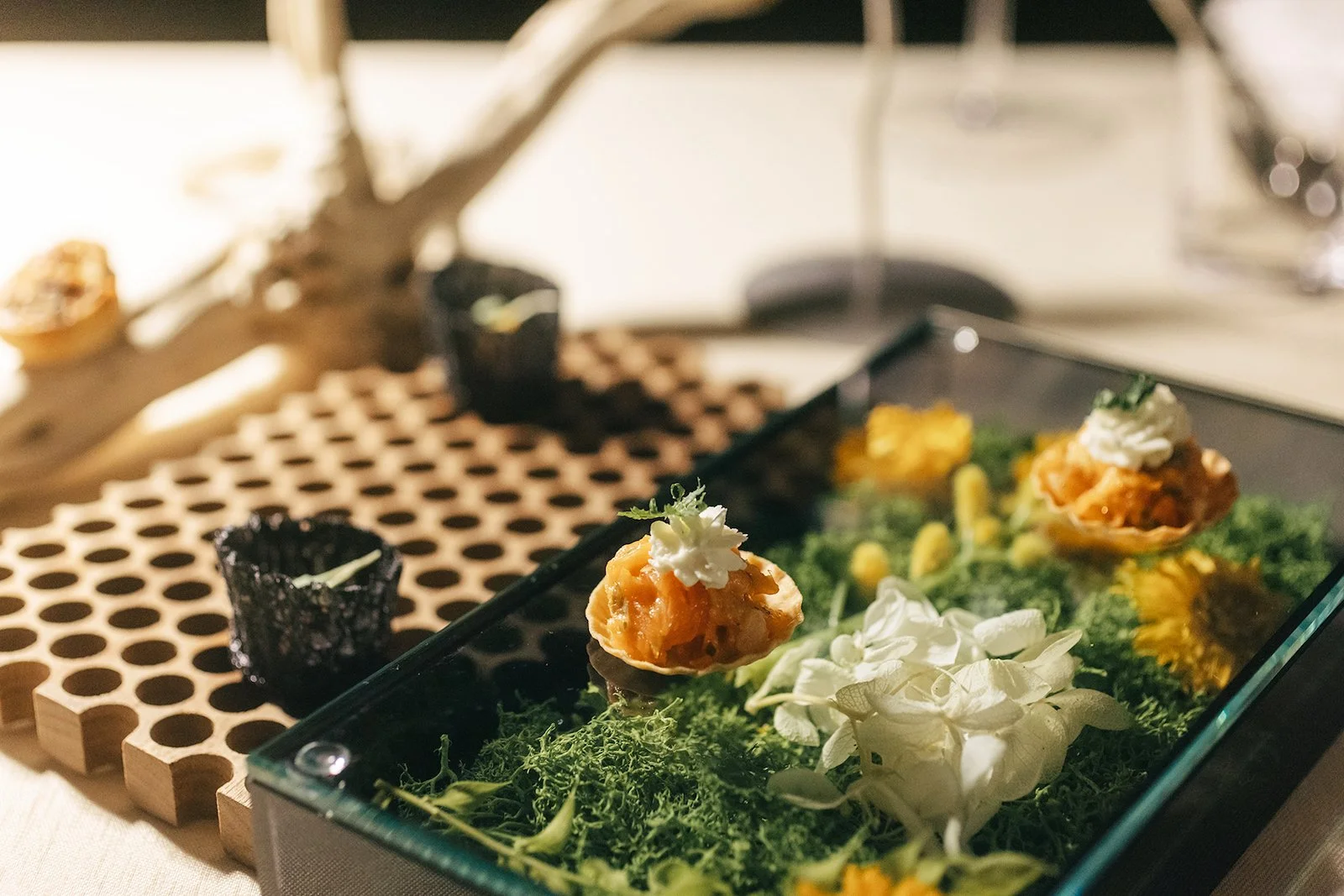 稚鮎のフリット、馬肉のタルタルなど、器やプレゼンテーションにも趣向を凝らした当日のアミューズ