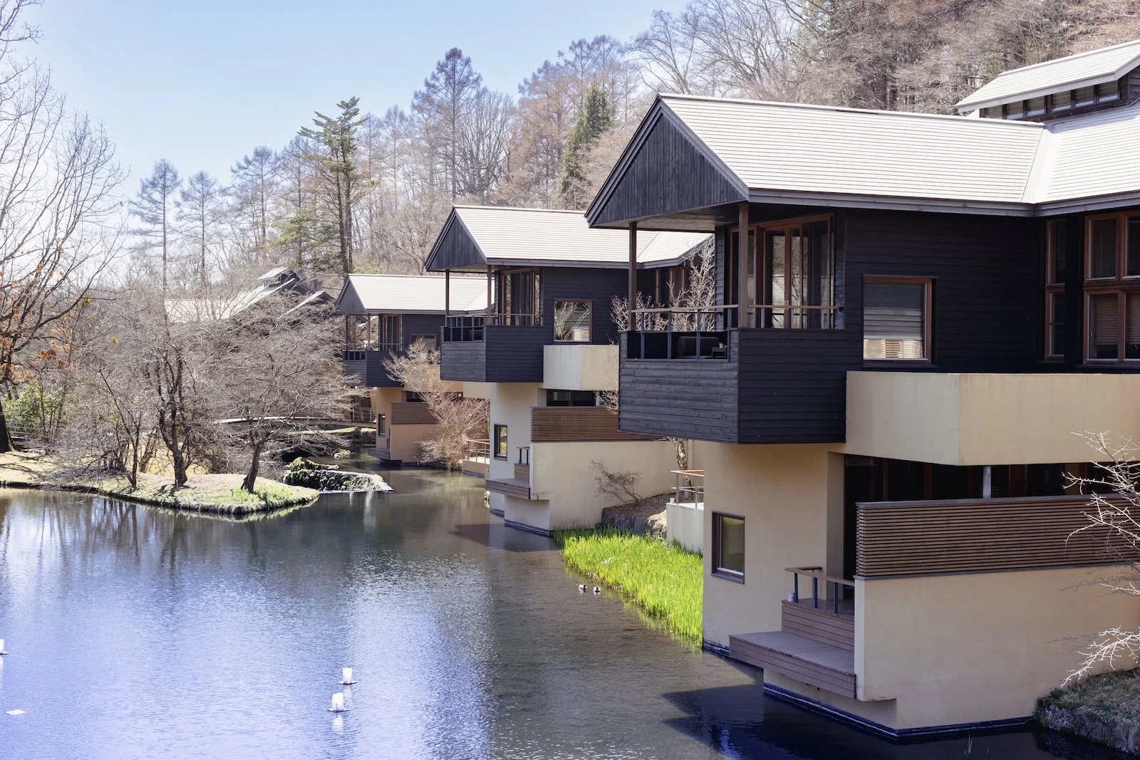 浅間山の麓、野鳥の森に隣接する谷あいに広がる集落。客室は別荘のように点在し、自然に囲まれている。ここでは「泊まる」より、「暮らす」感覚で、心身ともに深い休息が得られる。