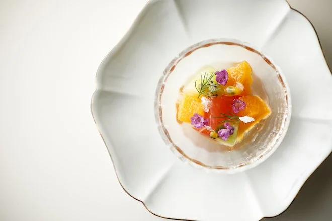 1品目は、グレープフルーツ、オレンジ、パッションフルーツに、1つまみの塩とバスク産の唐辛子を添えて。仕上げに香り高いレモングラスを注いで、夏にぴったりの爽やかなスターター。