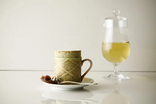サマーアフタヌーンティーの最後を締め括るのは、ピスタチオのコクとほのかなレモンの酸味が夏らしい、焼きたてのスフレ。ペアリングは、カモミールやラベンダーのブレンドティー。花の香りとほっとするような落ち着いた味わいのハーブティーが提供される。