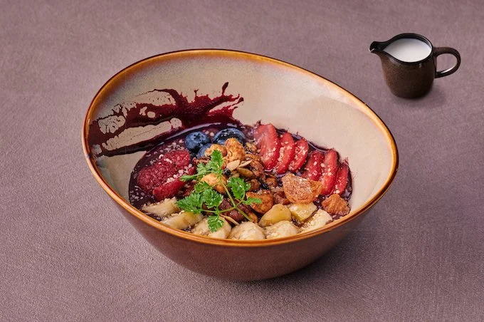 やさしい甘さが広がる「アサイーボウル」。“La proteinミルクティー”“味をブレンドしたアサイーピューレにアマニやピーカン ナッツなどを使用した自家製スーパーフードグラノーラと、ベリーやバナナ、デーツなどのフルーツをトッピング。“La proteinミルクティー”味をアーモンドミルクで溶いたものを別添えで用意し、好みでかける。