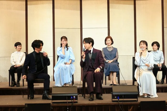 小山ゆうな(演出)とキャストの山崎育三郎、濱田めぐみ、武田真治、夢咲ねね、杜けあき、子役キャストの越永健太郎、ポピエルマレック健太朗、生出真太郎、豊田侑泉、小野桜介、長谷川悠大、奥田奏太、谷慶人が登壇。