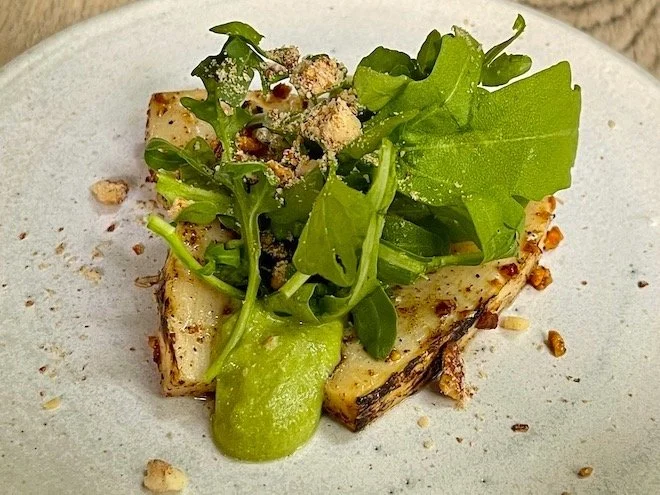 2皿目の冷前菜は、シーフードと野菜を使ったペルーや南米の料理であるセビーチェ。水蛸に、爽やかなセロリアック、オリーブオイルを加えている。TRUNKでかつて人気だったカクテルをトリビュートし、「ザ・グレンリベット 12年」をアペロールでスプリットしたペアリング。ドライパイナップルをあしらい、レモンジュース、オレンジリキュールを合わせたカクテルは、トロピカル&ワイルド。ネーミングも味わいも料理にマッチし、ジンジャーがピリッとしたアクセント。