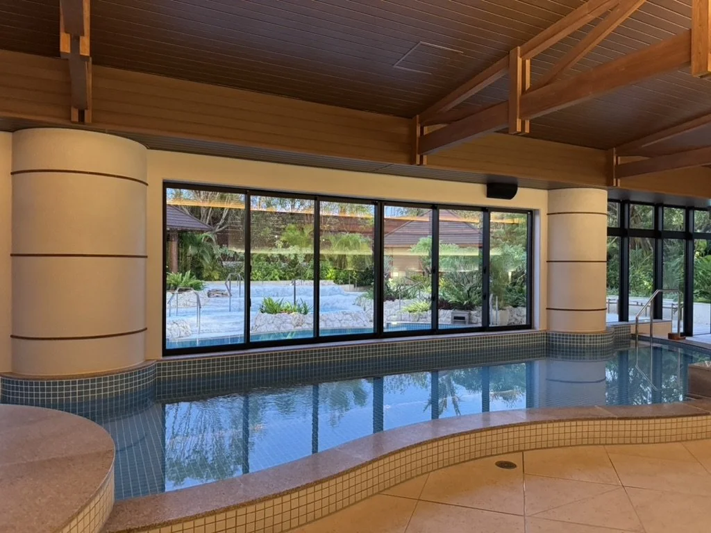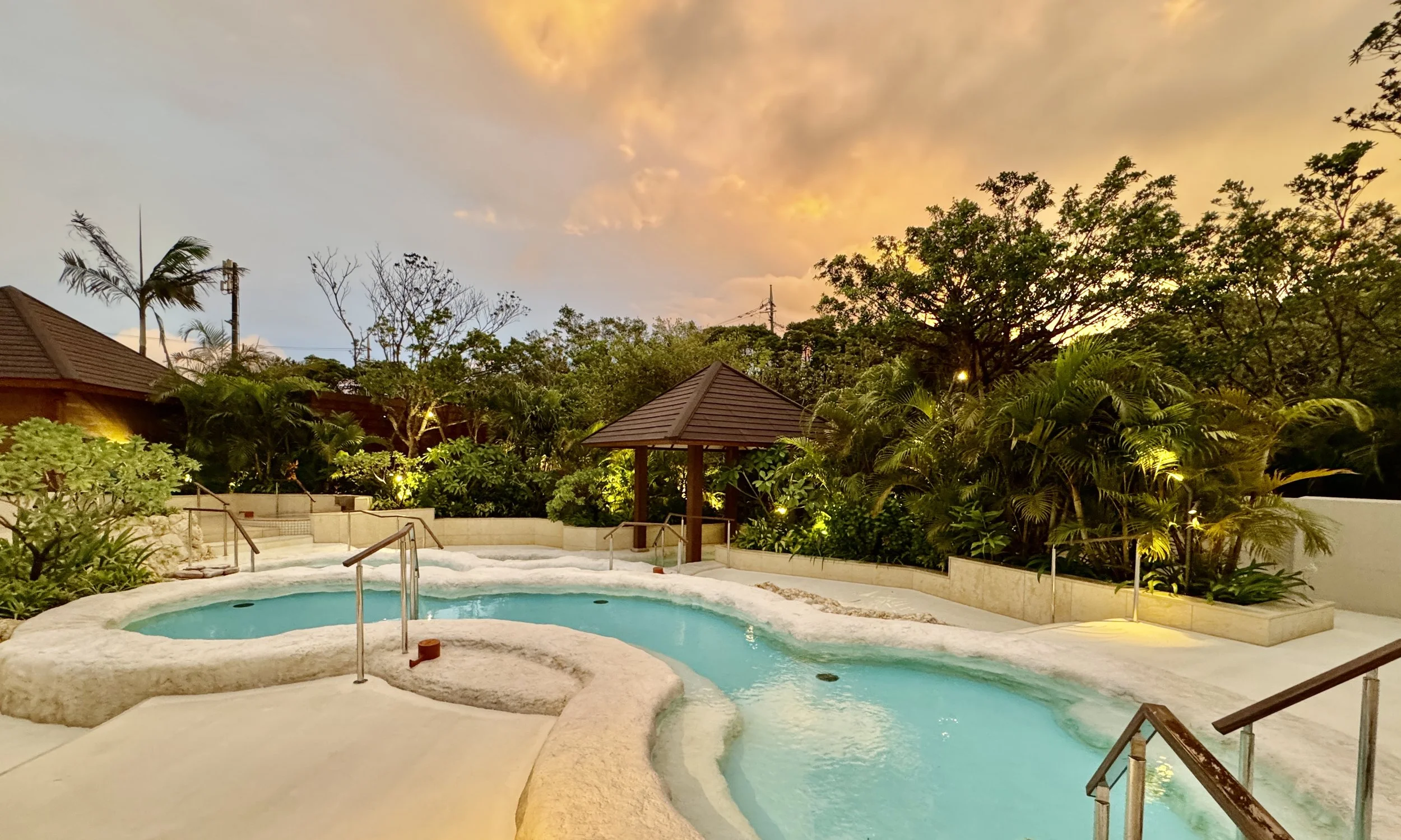 亜熱帯特有の深い緑の中、幻想的な雰囲気の「スパ ジャングリア」。南国ジャングルと空のコントラストが美しい絶景を望む、世界最大級のインフィニティ風呂を備え、大自然と一体となって包まれる癒しの時間が体験できる。アウトドアバスには、非日常的なリゾート感のある石灰岩風呂や、南国の緑に囲まれたサウナに水風呂、 インドアバスには天然温泉の大浴場、洞窟風呂など多くの種類を備える。温泉の源泉は、「今帰仁の湯(なきじんのゆ)」。アルカリ性単純温泉のお湯は柔らかく、美肌効果を持つ。