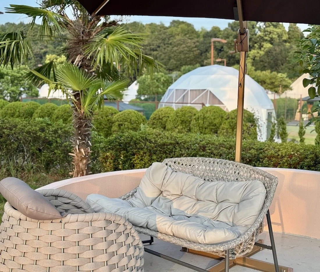 千葉県東金市のホテル&グランピングリゾート「UE GARDEN RESORT(ユイ ガーデン リゾート)」が、今年7月末にグランドオープンした。場所は、東京からの利便性がありながら、海岸も近い千葉県の郊外。自然の中でリラックスした気分が味わえ、楽器も演奏できる緑豊かなリゾートだ。