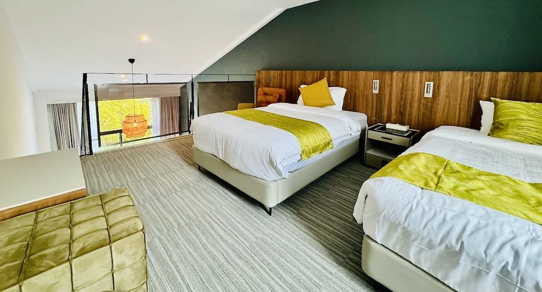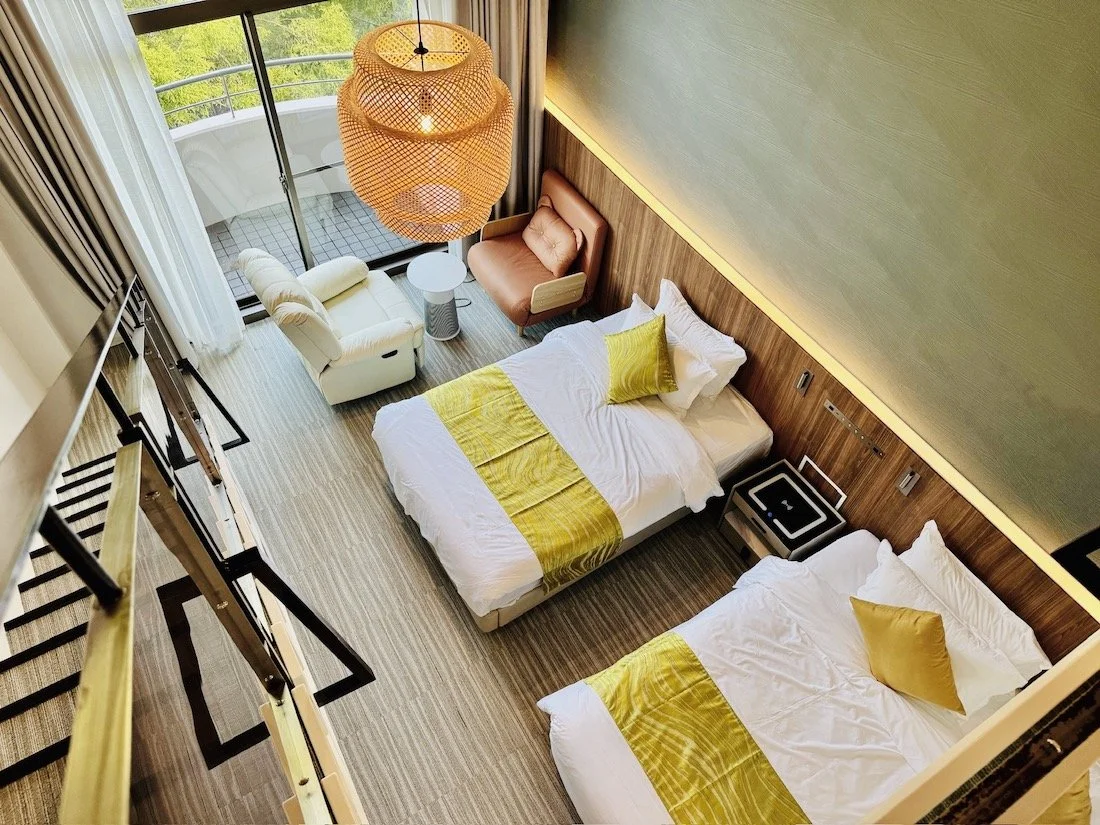 吹き抜けの空間が気持ち良いメゾネットには、1部屋に4台のベッドを備える。ホテルはいずれの客室タイプもセミダブルより大きい幅130cmサイズの大型ベッドを完備し、寝心地のよいベッドメーカーのマットレスが深い眠りに誘う。メゾネットは1部屋でありながら上の階は独立した寝室なので、程よいプライベート感が保てる。朝や日中は室内にいながら、施設内の緑豊かな眺望が広い窓から楽しめる。