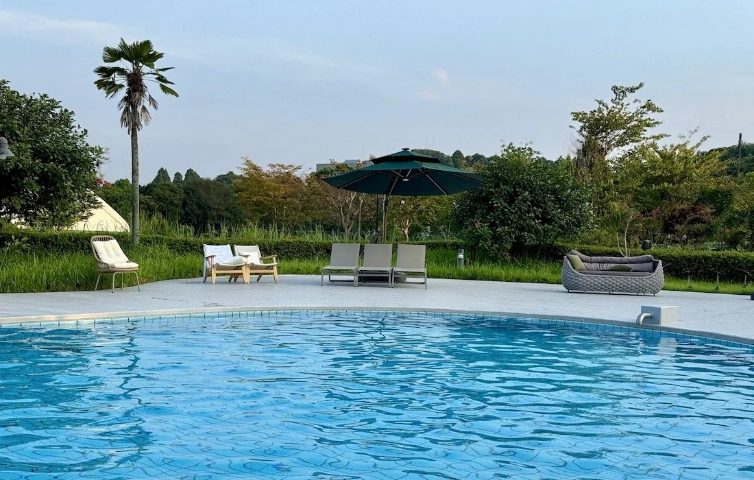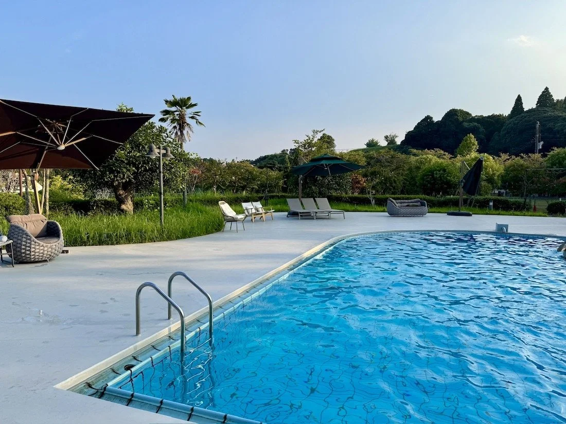 アウトドアのプールでは、森の自然を眺めながらデッキチェアでくつろげる。都内近郊ながら、のんびりとしたリゾート感が味わえ、宿泊者は夏季限定のプールに滞在中は無料で入れる。