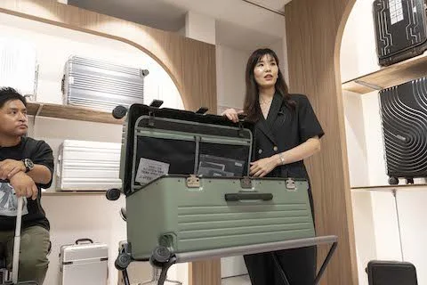 入口付近の試走ゾーンでは、異なる路面環境を再現し、引き心地の軽さや安定感、キャスターの静音性や走行性を実際に走らせて違いを体感。中央のレジエリアは空港カウンターを思わせるつくりに。さらに奥へ進むと、ゲートのようなアーチ形にスーツケースが並ぶ。奥のパッキングゾーンでは、 実際に荷物サンプルを詰めながら収納力をシミュレーションできる。トラベルグッズも充実し、ウィンドウ付近には記念撮影やSNSシェアも楽しめる旅気分のフォトスポットを設けている。