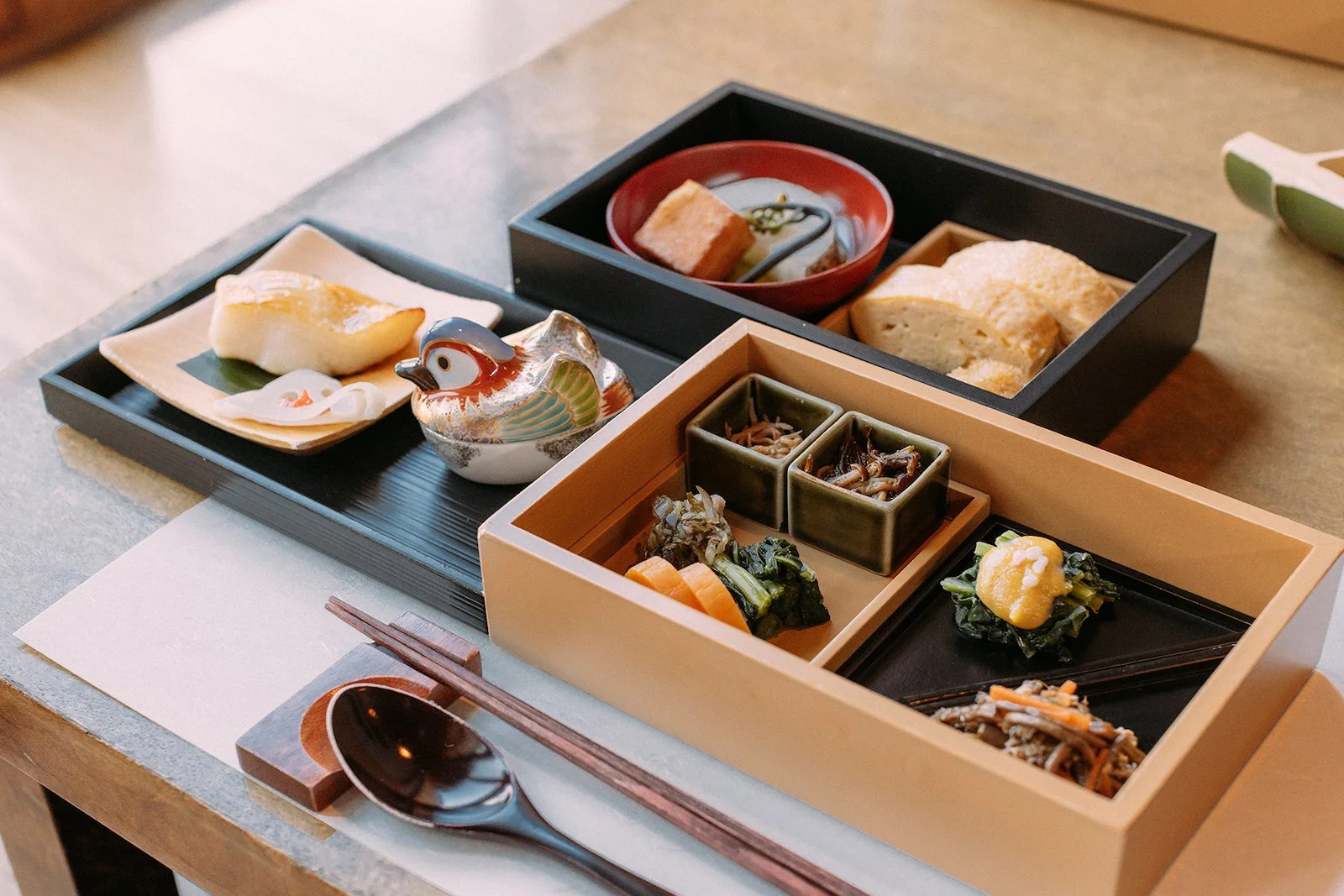 朝食は、「日本料理 嘉助」で野菜を丸ごと使った出汁をベースにした「山の朝食」。筍や山菜を中心にした若竹鍋に、膳の炊き合わせ、だし巻き卵などが並ぶ。冬の間に溜まったものを、春の山菜が外へと促す。その考えのもと、身体の巡りを整える食事が用意されている。数種の野菜の優しい味わいが、内側から整えていく。